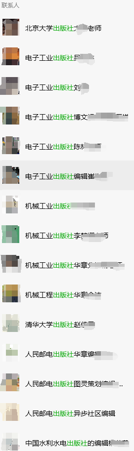 出版社相关老师微信列表也就是说,当我们还是小白没有所谓影响力的时候,持续写作就是提升影响力的方式。有一点类似俞敏洪老师讲过的大树和小草的经典演讲的理论“遥远的地方,别人能够看到你......”