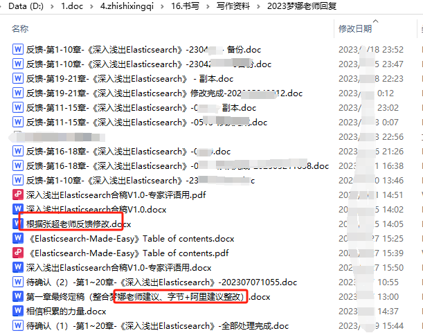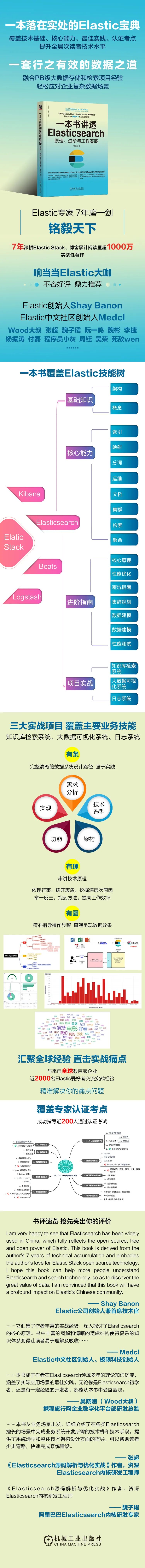 我很感激能参与书的名称和封皮设计环节。我最早起名《Elasticsearch实战开发指南》、《死磕Elasticsearch》、《深入浅出Elasticsearch》等都被否定了,前者名称和已有出版物没有区分度、中间名称字眼不吉利,后者类似书名非常多了,最终编辑老师敲定了现在的书名《一本书讲透Elasticsearch》