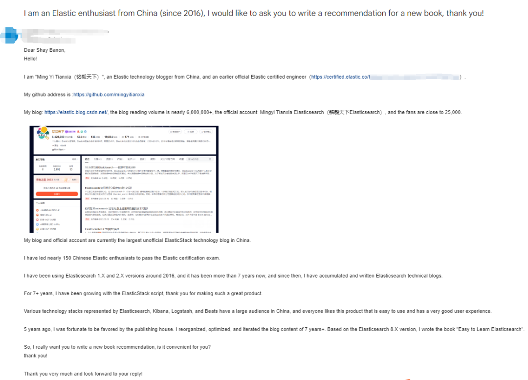 第一封把个人情况及要对方做的事要逻辑非常清晰的阐明清楚非常重要。我自己一句话在标题写清楚了诉求,方便对方能至少点开“I am an Elastic enthusiast from China (since 2016), I would like to ask you to write a recommendation for a new book, thank you!”