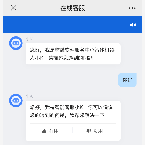 为了提供更高效的服务体验,2023年11月底,麒麟软件在线智能客服系统(“麒麟软件”、“麒麟软件技术服务”、“易用宝”公众号平台以及银河麒麟桌面操作系统V10SP1“服务与支持”)推出了智能机器人“小K”。自上线以来,已经累计产生了超7万条会话量,做到了秒级响应,大大缩短了解决问题的时间!