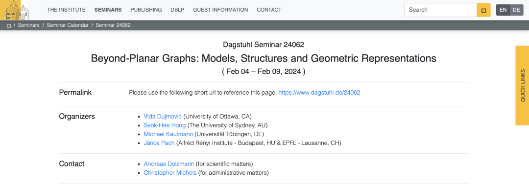 由加利福尼亚州渥太华大学、澳大利亚悉尼大学等高校组织的Dagstuhl研讨会24062将于 2024年2月4日-2月9日召开。本次Dagstuhl研讨会将研究超平面图,特别是它们的组合和拓扑结构(即密度、厚度、交叉图案、色数、队列数和堆栈数)、计算复杂性和识别算法、几何表示(即直线绘制、折线绘制、交点图)及其在现实世界网络可视化中的应用。本次研讨会的基本科学挑战和重大进展的背后,是对现实世界大型复杂网络的有效可视化算法的实用需求。