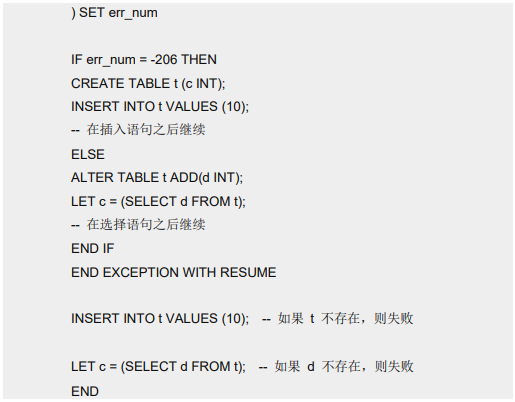 语句自动地恢复执行。如果 ON EXCEPTION 声明未包括 WITH RESUME 关键字,则执