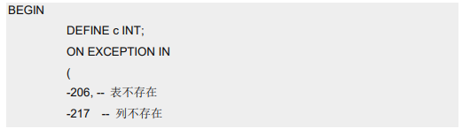 要捕获错误,请将一组语句包含在以 BEGIN 与 END 标记的语句块中,并在该语句块的 开头添加 ON EXCEPTION IN 语句。如果在跟在 ON EXCEPTION 语句之后的块中发生 错误,则您可采取恢复措施。
