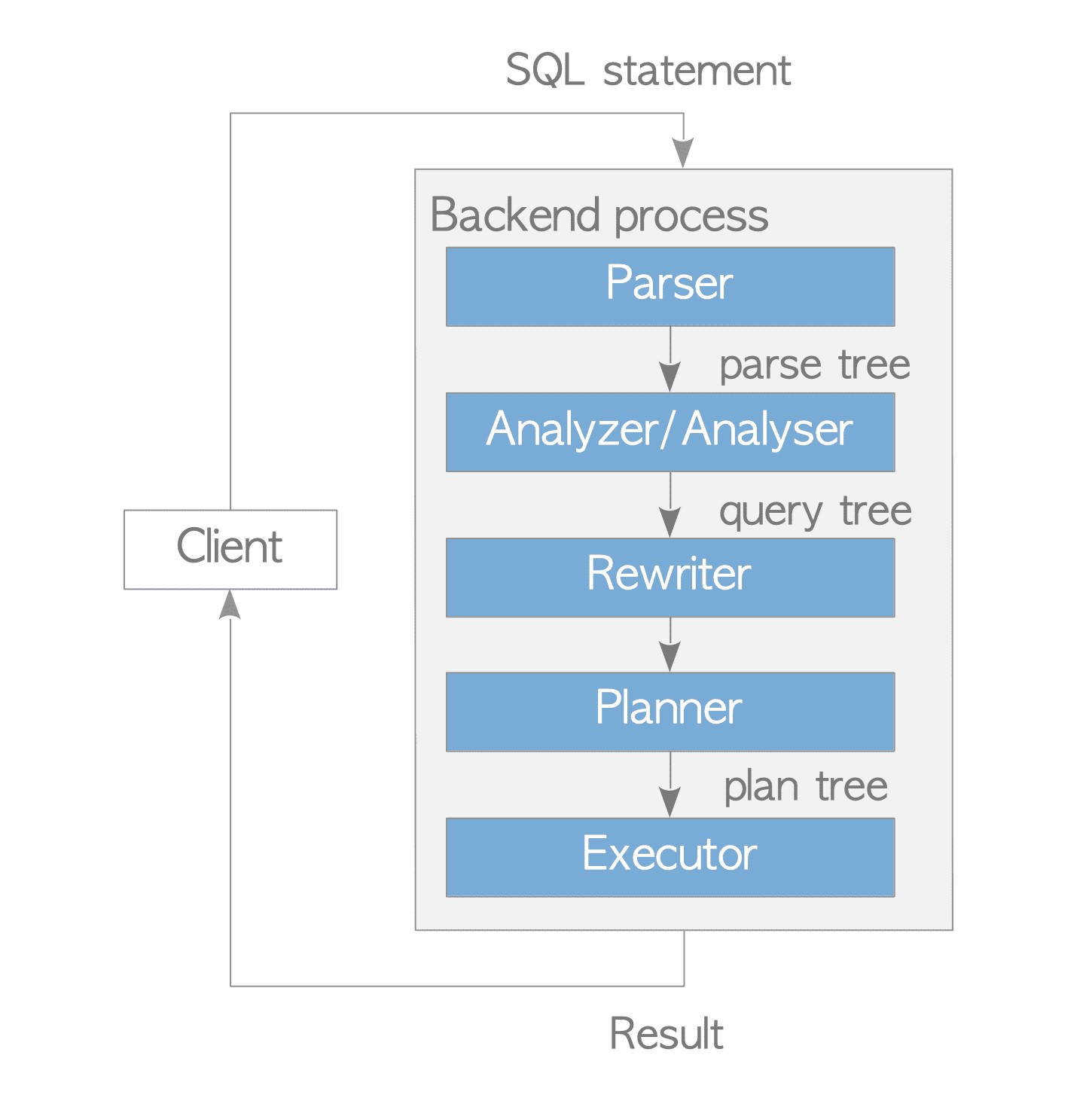 REWRITE优化、执行计划生成、执行计划选择、执行等过程。在PostgreSQL中,可以用下面这个图来表示。