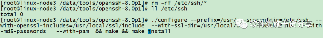 rm -rf /etc/ssh/*./configure --prefix=/usr/ --sysconfdir=/etc/ssh --with-openssl-includes=/usr/local/ssl/include \--with-ssl-dir=/usr/local/ssl --with-zlib --with-md5-passwords --with-pam && make && make install