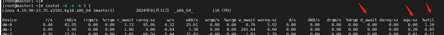 iostat -d -x -k 1 1 查看设备使用率(%util)、响应时间(await)