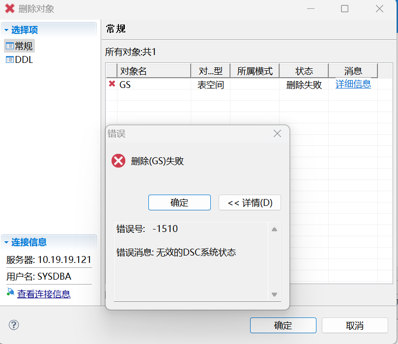 使用上述的客户端工具删除用户正常,删除表空间时报-1510:无效的DSC系统状态,如下,