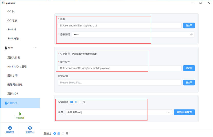 测试配置阶段使用开发测试证书,方便安装到手机测试混淆后ipa是否工作正常,测试ok,最后准备上架的时候再改成发布证书和发布描述文件