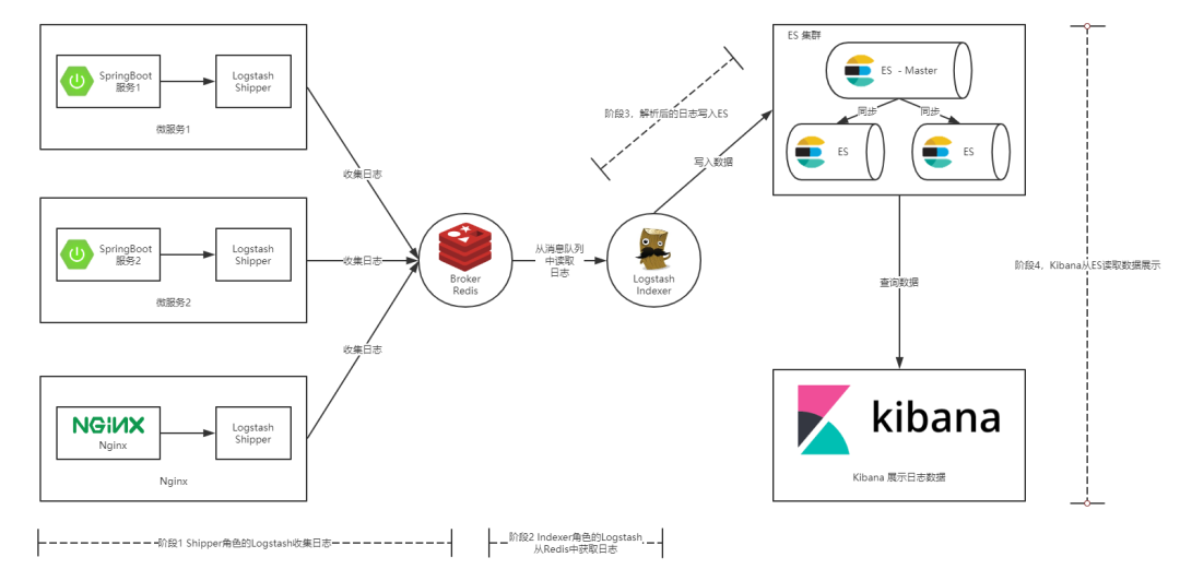 2)datasource->logstash->redis/kafka->logstash->elasticsearch->kibana