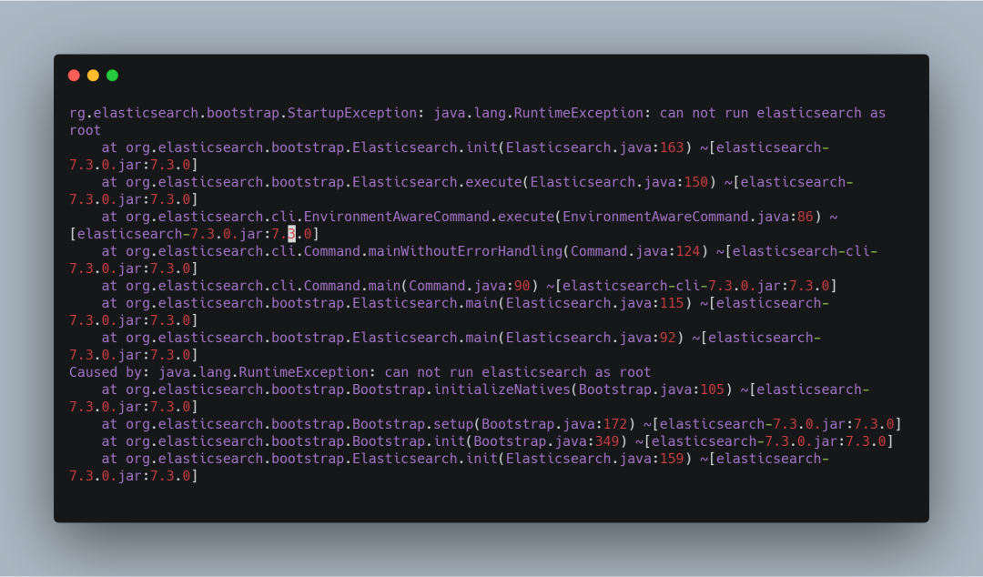 如果您是以 root 用户启动的话,就会报下图所示的错误。解决方案自然就是添加一个新用户启动 Elasticsearch。