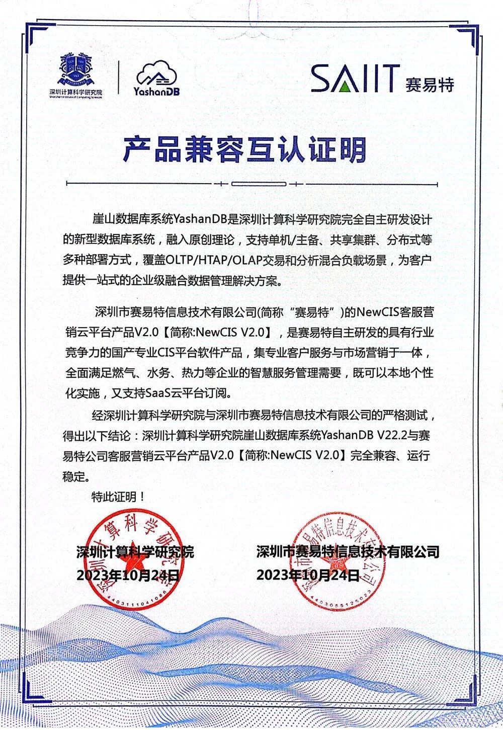 近日,深圳计算科学研究院崖山数据库系统YashanDB与深圳市赛易特信息技术有限公司(简称:赛易特公司)自主研发的客服营销云平台(NewCIS V2.0版)完成兼容性互认证。经严格测试,双方产品完全兼容、运行稳定。