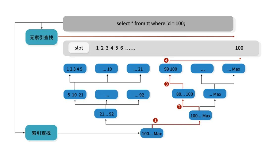 以上图为例,通过索引Key排序并存储到对应的数据结构内,可通过二分法快速定位数据的存储位置。查询Id值为100的行时,如果使用无索引查找,需要遍历Id值为1 - 100的所有行;如果使用索引查找,则只需要4次跳转即可快速定位到Id为100的行。