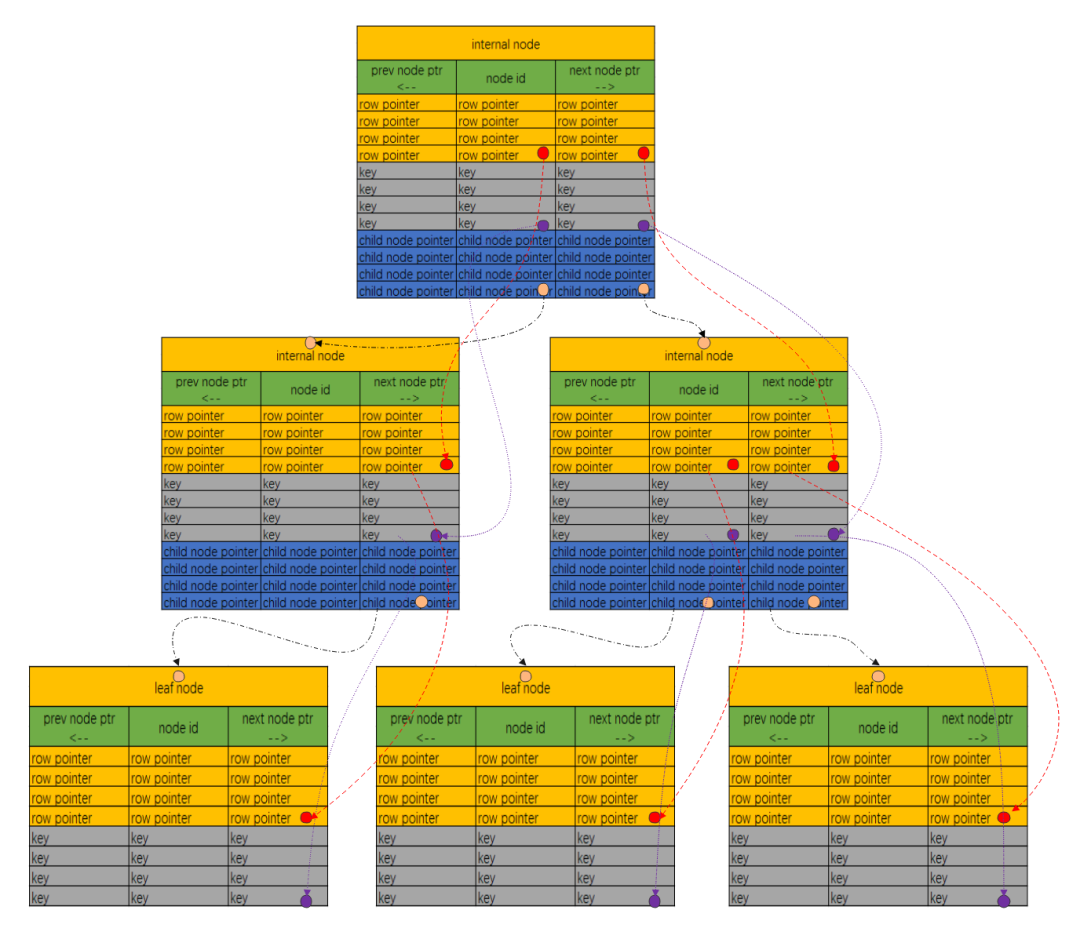 Qcubic内存索引的内部结点存储了行指针、Key值和子结点的指针。不同于传统磁盘数据库索引,这里的行指针和子结点指针均为内存地址而非ROWID(文件内偏移位置)。之所以采用这样的方法是Qcubic的所有数据都存储在内存中,无需通过ROWID换算其存储位置,可加快访问速度。