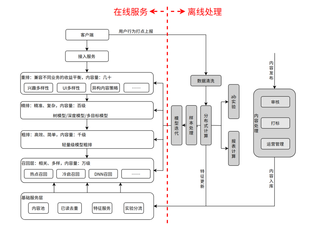 AB实验,也被称为A/B测试,是一种统计学方法,通过对比两个或多个版本的事物,以确定哪个版本对目标的影响更大,目前在各大互联网公司有非常广泛的应用。例如在字节跳动,2023年中数据显示,A/B测试平台目前服务了500多条业务、在线上开的实验总量超过了240万,每天新增的实验数有4000余个,同时线上运行的实验数有5万余个 。随着移动互联网的快速发展,用户规模和网络信息量都得到了爆炸式增长。在此背景下,信息过载导致用户产生选择焦虑,推荐系统也就应运而生。可以说,推荐系统本质上是在用户需求不明确的情况下, 为用户从海量的内容中寻找其感兴趣的内容的技术手段,通过结合用户的基础信息(地域,年龄,性别等)、用户的历史行为(点击、播放、购买等)、以及内容本身的特征(分类、标签、价格等),利用机器学习技术构建用户的兴趣模型,再叠加一定的推荐策略,实现为用户提供精准的个性化内容服务,使流量得到充分的利用,最大限度地提高内容转化效率及用户获取信息的效率。虽然不同推荐产品的体验和调性差异很大,但其背后的推荐系统总体技术方案大同小异,一般都由在线服务和离线处理两个模块组成:在线服务是为用户提供内容的个性化推荐服务。其对效率要求比较高,需要在百毫秒级完成从海量备选集中筛选用户感兴趣的内容,一般由召回、粗排、精排、重排四个阶段组成。这四个阶段所处理的内容量由多到少、处理复杂度由简单到复杂、内容和用户的相关性由弱到强,随着阶段的推进逐步完成推荐。离线处理辅助于在线服务,能够为在线服务提供内容基础和数据基础:● 用户发布的内容经过审核、打标签以及内容运营,筛选合规、优质内容,构建推荐内容池● 对用户行为数据进行处理和计算,生成样本和特征,更新和优化推荐模型● 结合A/B实验分流结果和用户行为的打点上报,用于指标计算和实验分析,也可搭建指标报表和dashboard,观测如dau、用户时长等核心指标的走势推荐系统中经常会有推荐算法、策略、特征、功能、UI的迭代,特别是推荐算法。但由于现在广泛应用深度学习模型,本身具有很强的黑盒属性。所以在进行调整后,用户体验如何,是否向着预期的方向发展,都无法通过经验来判断,需要通过A/B实验量化指标变化才能进行评估及后续优化。因此,可以说A/B实验和推荐系统是相生相伴的,有推荐系统就必须有A/B实验。接下来就重点介绍A/B实验在持续改进推荐系统中的应用以及分享一些实践经验。一个标准的A/B实验包含分析并提出假设、实验设计、实验上线、实验观测、实验决策五个环节:● 基于分析提出假设:即在业务体验和数据分析过程中,基于发现的问题和可优化点,提出某个实验的假设。例如某信息流推荐开发同学,在体验业务时提出一个假设:如果用户在消费视频时若能产生点赞关注等互动行为,可提升用户黏性从而提升用户留存。● 实验设计:确定实验策略、实验目的、实验对象、实验时长等。例如基于上面的假设,可设计针对低活跃用户,优化推荐模型的实验策略;目标是提升用户留存率;实验时长则建议设置14天以上,覆盖两个完整周,以此消除工作日与周末用户消费视频的差异及波动。● 实验上线:按照设计的实验方案,实现业务逻辑并进行线上实验。且需要在上线前通过设置实验白名单,体验并检查实验逻辑是否符合预期。● 实验观测:实验上线后,观察实验指标的变化趋势。这个阶段也可以抽样检查实验用户的推荐结果和行为数据,进一步验证实验逻辑是否正确。● 实验决策:根据实验结果决定下一步计划,若实验效果为负向,则应关闭实验或进行相应的数据分析并迭代优化实验策略后重新上线实验;若实验有显著正向,则可全量发布,且在全量发布时建议同步创建反转实验,以便观察实验的长期收益。因为一般A/B实验的周期相对比较短,短期的正向收益也可能是由于新算法或新策略的新鲜度较高带来的,因此可通过反转实验来检验长期收益是否符合预期。实验上线后,也可以进行进一步的数据分析发掘是否有新的A/B实验点,以此循环往复。在字节跳动,每天都运行着大量的推荐实验,以下分享几个我们积累的实践经验。推荐系统的本质是连接内容和用户,这样就构成了<内容,推荐系统,用户>的三元组,A/B实验也是围绕这个三元组展开。内容侧,可以进行内容池优化、内容打标优化、视频封面模型的优化等;用户侧,可以通过A/B实验实现功能优化、性能优化、UI改进等;而在推荐系统方面,可A/B实验的维度更多,例如多路召回优化、粗排和精排模型迭代升级优化、模型多目标融合优化、重排多样性/兴趣探索优化、广告收入优化等等,可以说,在推荐系统中,万物皆可A/B实验。需要指出的是,在进行内容侧的A/B实验时,例如信息流产品可能会做作者发布视频奖励、视频清晰度调整等,改变的是内容侧的属性,但我们通常观察的是大盘用户侧的指标。在进行这类实验时,建议转化为用户侧实验并辅助观测内容侧指标来评估,权衡用户侧和内容侧的综合收益后再决策是否上线。比如视频带货推荐中,商家分润规则调整仅对实验用户生效,通过对比实验组与对照组的指标差异评估对大盘的影响的同时,可以创建并观察商家入驻率等内容侧指标的变化。在大盘收入指标不变、商家入驻率指标有提升,甚至大盘收入指标微跌、商家入驻