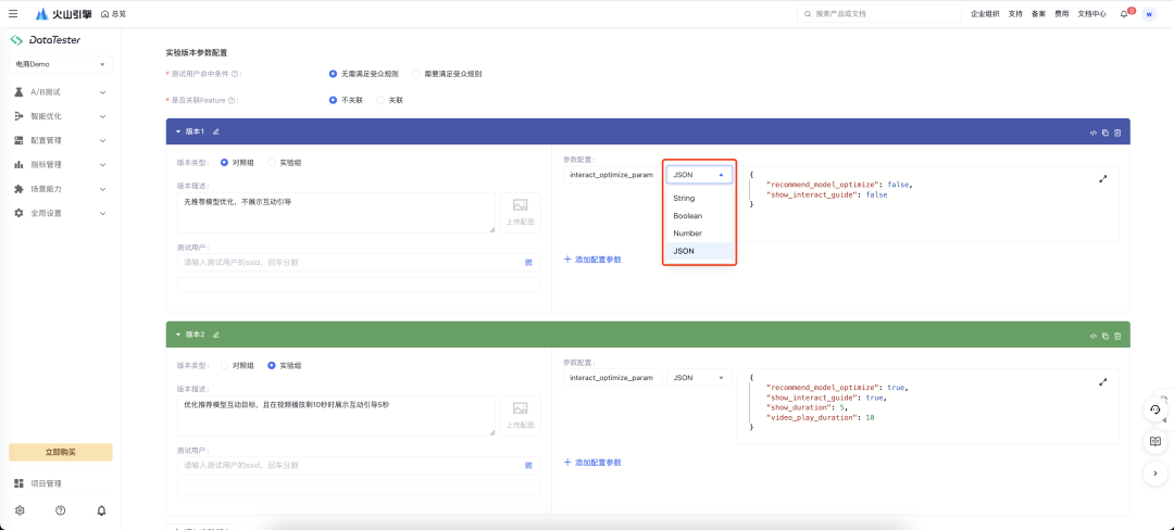 合理的实验参数应该按功能控制维度来设计,针对上面的实验,可以设计如下控制参数,然后通过这些参数的组合达到实验的效果:{"recommend_model_optimize": true 是否进入推荐模型互动目标优化,true-是,false-否