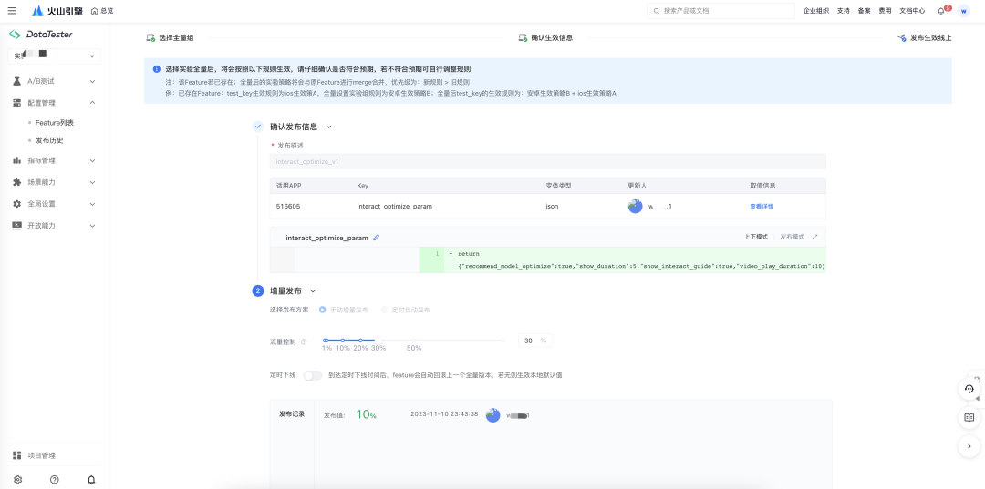 通过以上设计的实验参数,便可实现多个功能维度的A/B实验。可以说,合理利用实验参数,往往可以达到事半功倍的效果,这一点在移动端APP实验中尤为重要,因为APP一般发版周期长,无法做频繁变更,而有了实验参数,就可以在不发版的情况下,开启多组不同参数的A/B实验,筛选最优参数组合在线上生效。当A/B实验决出优胜组后,我们便可以将优胜组的策略全量发布。那么如何发布呢?一种做法是修改代码,将优胜组策略对应的参数对全量用户生效,同时将对照组下线,这种方式的缺点是每次全量发布都需要修改代码后发布上线,流程复杂增加了出错风险,特别是如果要全量发布客户端实验,考虑到客户端发版除了开发测试,还需要应用商店审批上线,这种方式将会严重影响迭代效率,并且这种方式难以回滚,在新特性上线时可能会造成上下游服务负载过高而影响用户体验。基于以上可能存在的问题,一般的做法是会开发一套配置系统,将A/B实验控制逻辑配置化,当需要全量发布实验时,只需要全量发布对应实验配置即可,若发布时出现异常可通过回滚配置恢复服务。在DataTester,除了能够为用户提供A/B实验的能力,还能为用户提供FeatureFlag功能,以满足A/B实验全量发布的诉求,用户无需再开发上述的配置服务。基于FeatureFlag功能,全量发布实验时,用户仅需要将实验配置固化为Feature,然后发布Feature即可,同时此功能支持自定义流量满足灰度发布的需求,保护上下游服务,出现异常时也支持配置秒级回滚,高效保障服务安全上线。以上就是DataTester在推荐系统改进中的实践及其经验总结,希望对大家有所启发。火山引擎DataTester源自字节跳动长期沉淀,是科学可信的A/B测试与智能优化平台。DataTester目前服务了包括美的、得到、凯叔讲故事等在内的上百家企业,服务多个亿级用户业务,助力企业在业务增长、用户转化、产品迭代、策略优化以及运营提效等各个环节科学决策,将成熟的“数据驱动增长”经验赋能给各行业。