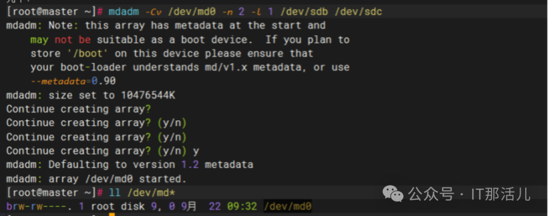 注:如没有mdadm命令,CentOS/RHEL通过以下命令安装(yum install mdadm)。mdadm -Cv dev/md0 -n 2 -l 1 /dev/sdb /dev/sdc