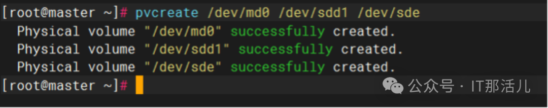 /dev/sdd创建磁盘分区(fdisk为交互式界面,配置过程略):pvcreate /dev/md0 /dev/sdd1 /dev/sde