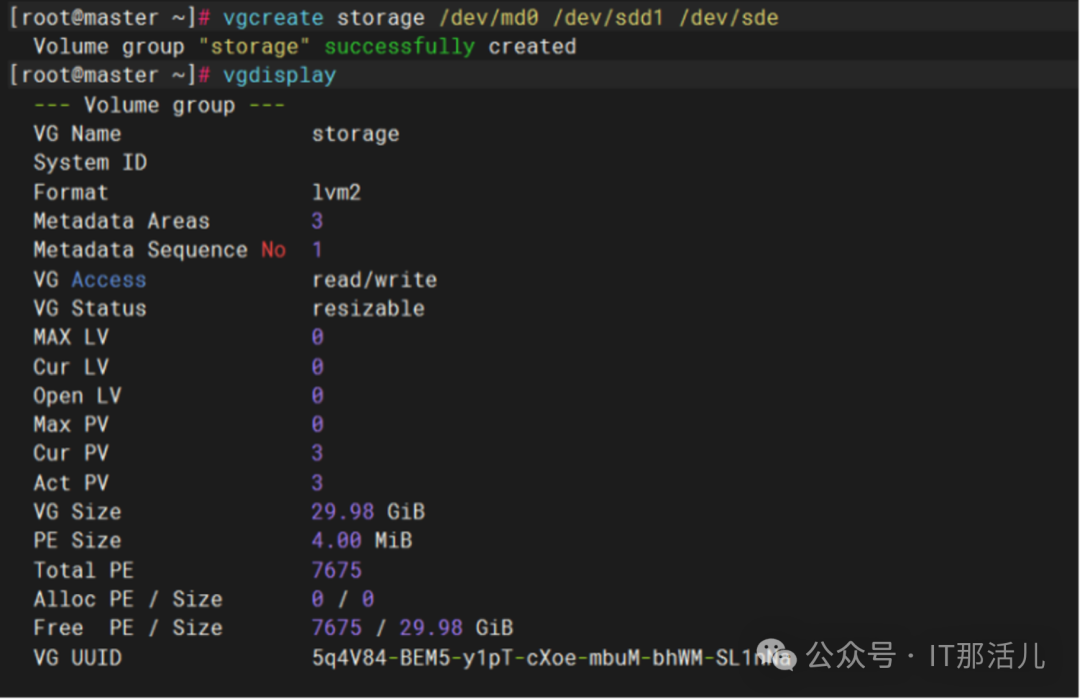 vgcreate storage /dev/md0 /dev/sdd1 /dev/sde