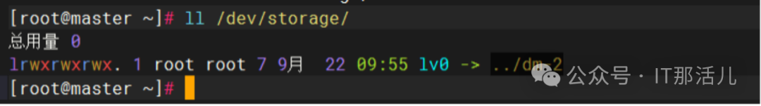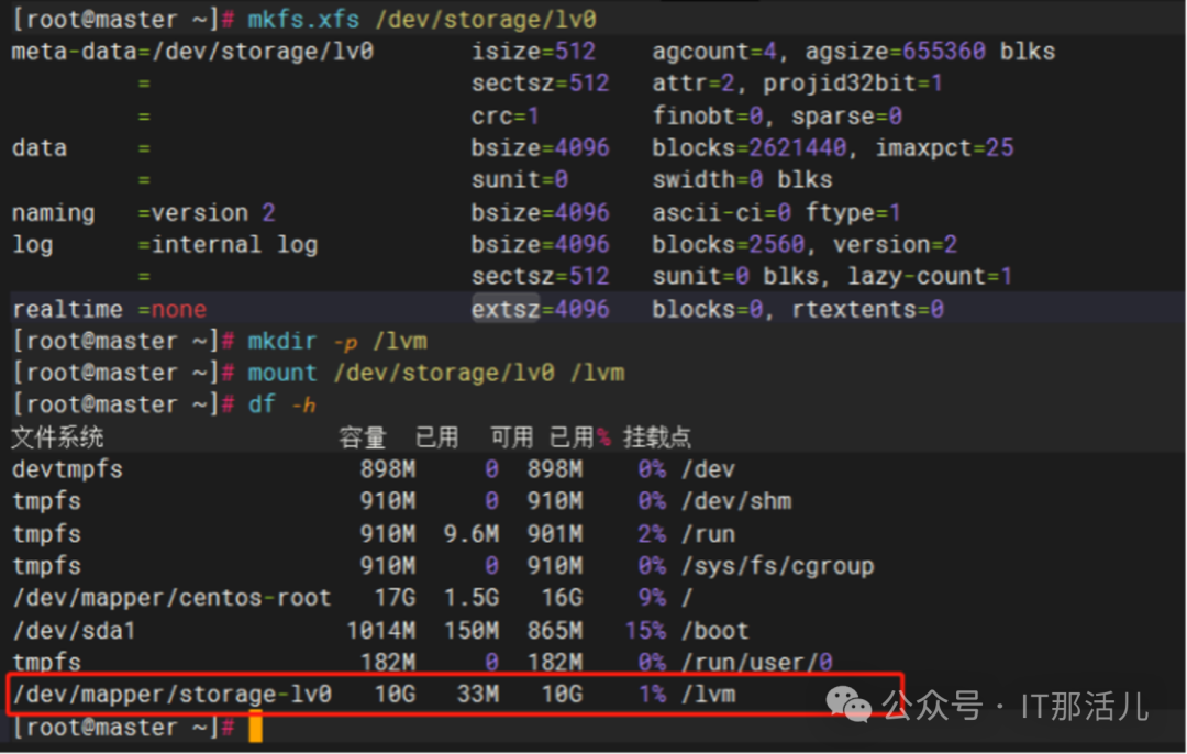 最终,我们在/dev目录下能够生成一个同名的磁盘文件,如下所示:这样,当我们创建文件系统、挂载后,就可以正常使用逻辑卷了,命令如下所示:mkfs.xfs /dev/storage/lv0
