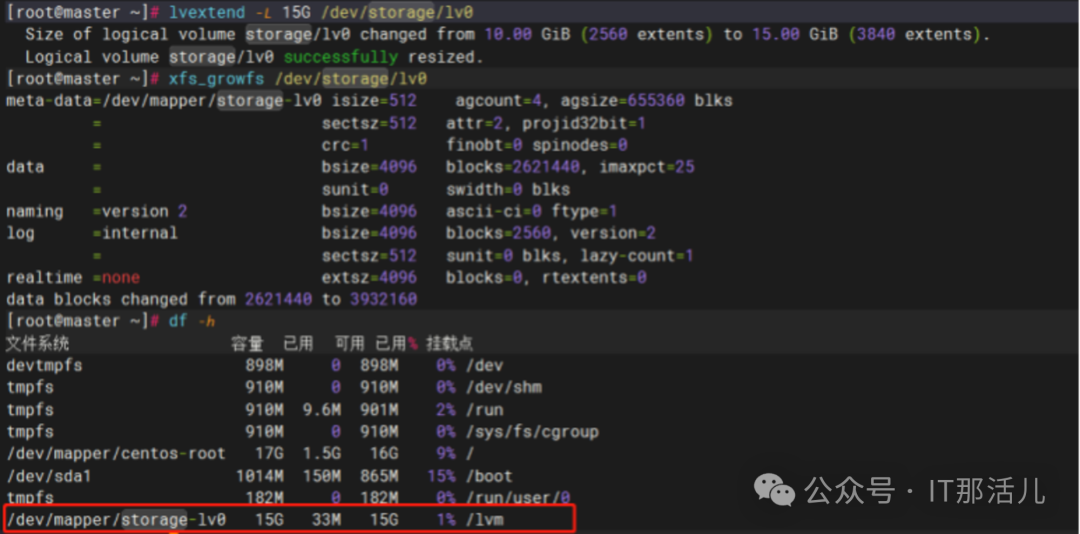 此时,我们已经可以查看逻辑卷的挂载情况了,效果如下所示:3.4 LV扩容