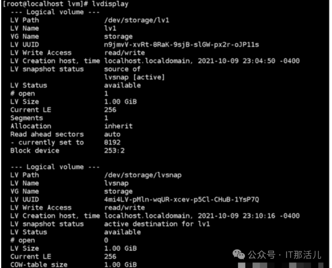 然后,我们创建快照卷,在lvcreate命令中,使用-s参数创建快照卷,如下所示:lvcreate -L 1G -s -n lvsnap /dev/storage/lv1