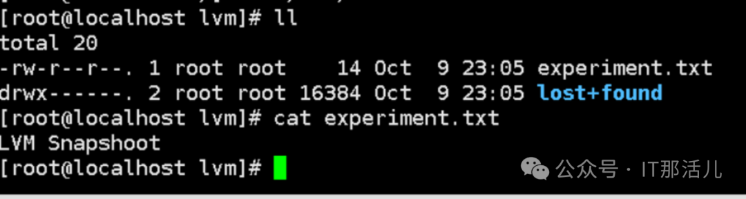 接下来,我们尝试使用快照卷的恢复功能,方法是删掉刚才在lv1中创建的experiment.txt文件,然后恢复快照卷,查看新的lv1中experiment文件是否存在。过程如下:rm -rf /lvm/experiment.txt