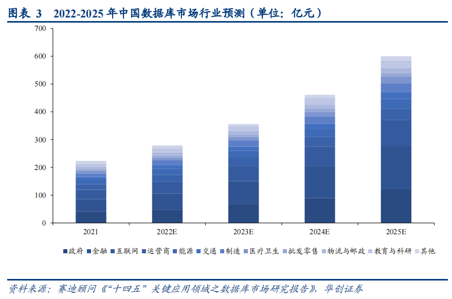 从数据库下游应用行业分布来看,“十四五”期间,金融、政府仍然是数据库最主要的两大市场。据赛迪顾问预测: 1) 政府领域: 数字政务将带来一定的市场空间,预计到 2025 年,政府领域市场规模将达到 121.9亿元。2) 金融领域: 由于业务类型及客户需求的变化,信息化建设有望加速推进,预计到 2025 年,金融领域市场规模将达到 153.7 亿元。