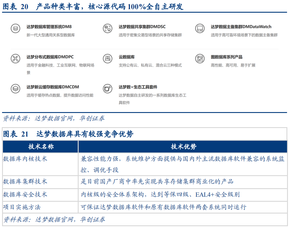 “数据库代表性厂商近年来营收保持良好增长趋势。核心厂商指标表现各有所长,发展势头良好。2018-2022 年,达梦数据营业收入保持良好增长趋势。”“坚持全自研路线,党政为公司优势领域。2022 年达梦数据在中国数据库管理系统国产数据库和事务型数据库管理系统市场占有率均排名第一,公司具有完全自主知识产权,其代码自主原创率达 99.9%,在安全性方面为国产数据库最高安全级别。”