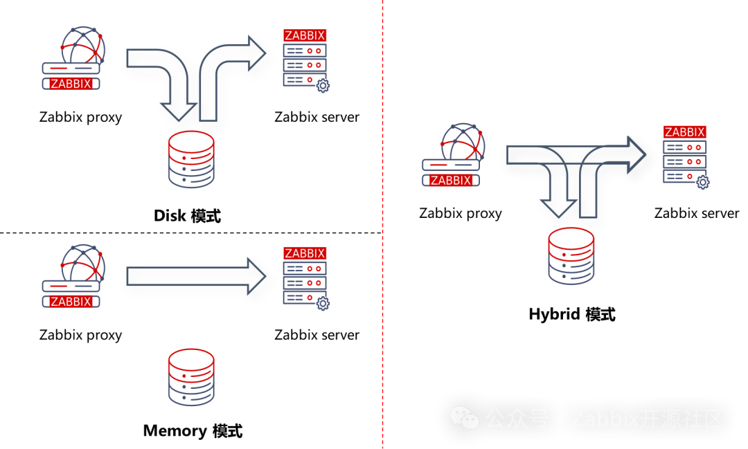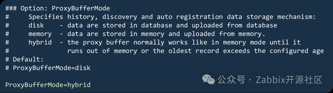Zabbix7.0支持多种Proxy缓存模式,Disk、Memory和Hybrid。Disk即之前版本的磁盘存储;Memory为内存存储,所有数据放在内存中;Hybrid是Disk和Memory的混合,内存不够就磁盘存储。