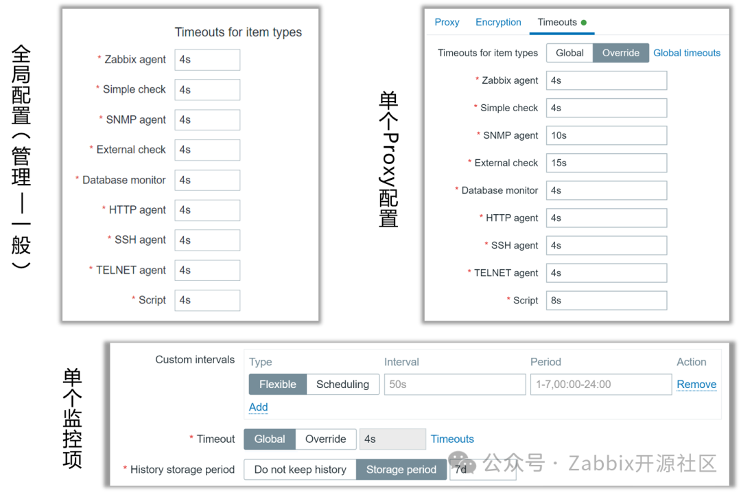 Zabbix7.0为大部分数据检查引入监控项级别Timeout,可在前端页面配置Timeout数值,取值范围1秒到600秒(10分钟)。Timeout可在多个层级定义,包含Zabbix Server全局配置、单个Zabbix Proxy级别以及单个监控项。