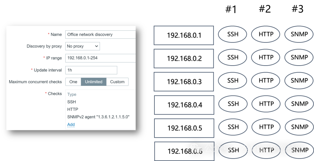 当网络自动发现中扫描的IP或者网段过多,并且包含多个检查规则时,完成一次任务将消耗大量时间,这是因为单个任务只能被单个discoverer进程处理,并且每个IP按顺序执行。