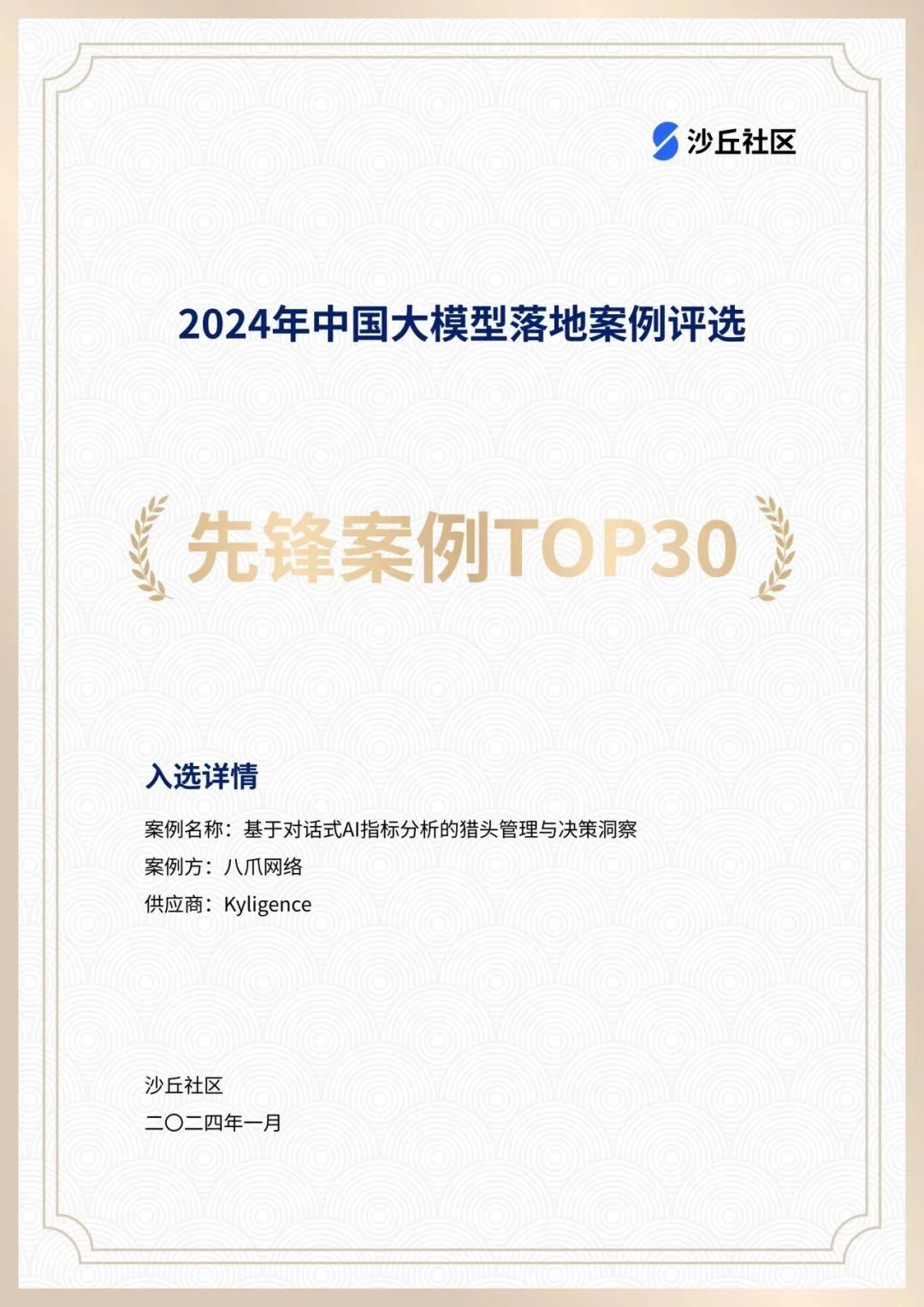 沙丘社区对 212 个大模型落地案例进行评估,从中评选出最具先锋性的 TOP 30 案例,Kyligence & 客户八爪网络(猎必得- CSDN 人才云服务)合作案例「基于对话式 AI 指标分析的猎头管理与决策洞察」成功入选。