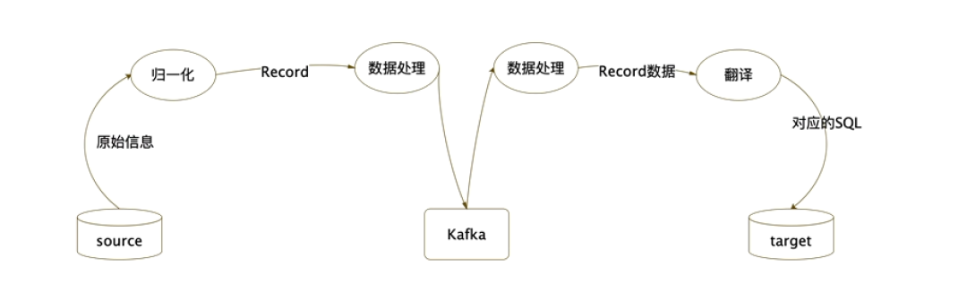 新架构增加了对采集数据的归一化处理,且采用了采集端和目标端完全分离的架构,即Reader不需要感知目标库类型,只需要将采集到的数据按照归一化逻辑统一处理为同样的格式的Record;Writer不需要感知采集端类型,只需要将数据按照目标库的数据类型装载即可。如图所示: