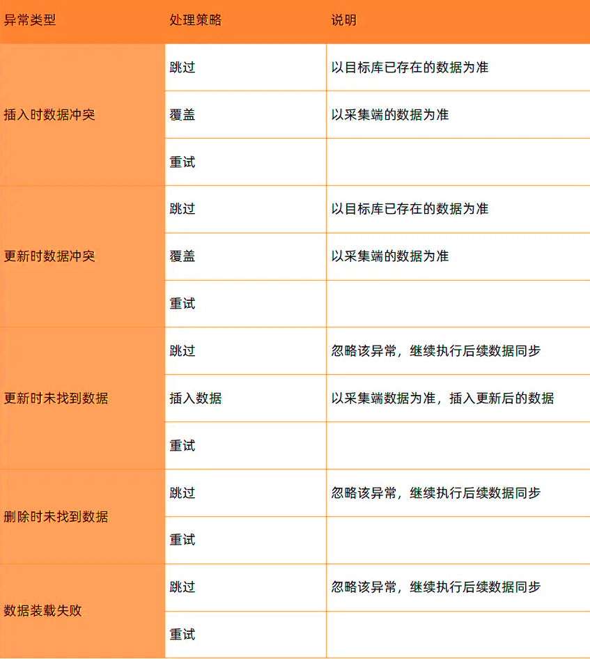 通过增加对增量同步异常处理策略的支持,在某些数据不一致的场景下可以保证增量任务不间断的进行数据同步,同时用户可以实时查看到同步工具处理的异常数据的信息,进而提升了整体服务的可用性,提高了整体同步的准确率。