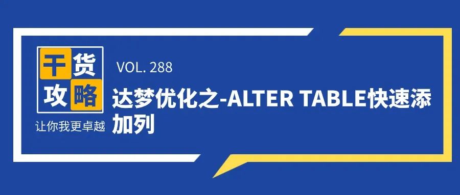 --查询目前值SELECT PARA_NAME,PARA_VALUE,FILE_VALUE FROM V$DM_INIWHERE PARA_NAME='ALTER_TABLE_OPT';--修改该参数为3SP_SET_PARA_VALUE(1,'ALTER_TABLE_OPT',3);--或ALTER SYSTEM SET 'ALTER_TABLE_OPT'=3 BOTH;