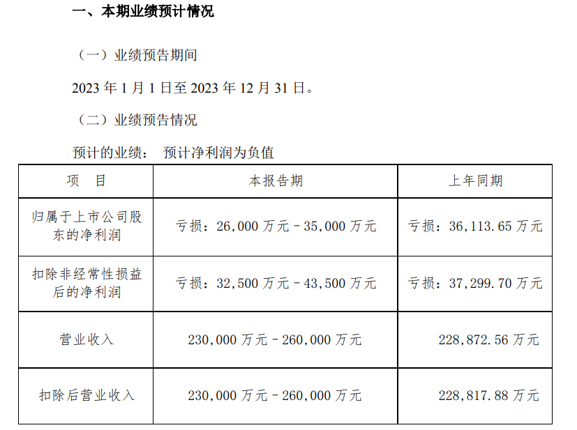 扣除非经常性损益 亏损:32,500 万元–43,500 万元 亏损:37,299.70 万元