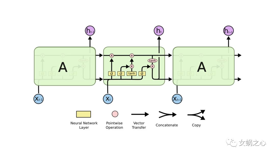 在下面的图例中,每一条黑线传输着一整个向量,从一个节点的输出到其他节点的输入。粉色的圈代表 pointwise 的操作,诸如向量的和,而黄色的矩阵就是学习到的神经网络层。合在一起的线表示向量的连接,分开的线表示内容被复制,然后分发到不同的位置。