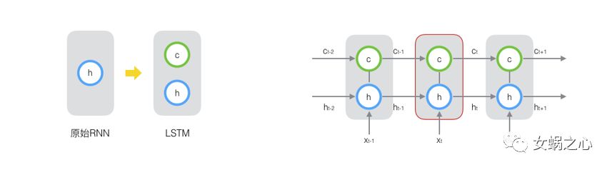 长短时记忆网络的思路比较简单。原始RNN的隐藏层只有一个状态,即h,它对于短期的输入非常敏感。那么,假如我们再增加一个状态,即c,让它来保存长期的状态。新增加的状态c,称为单元状态(cell state)。