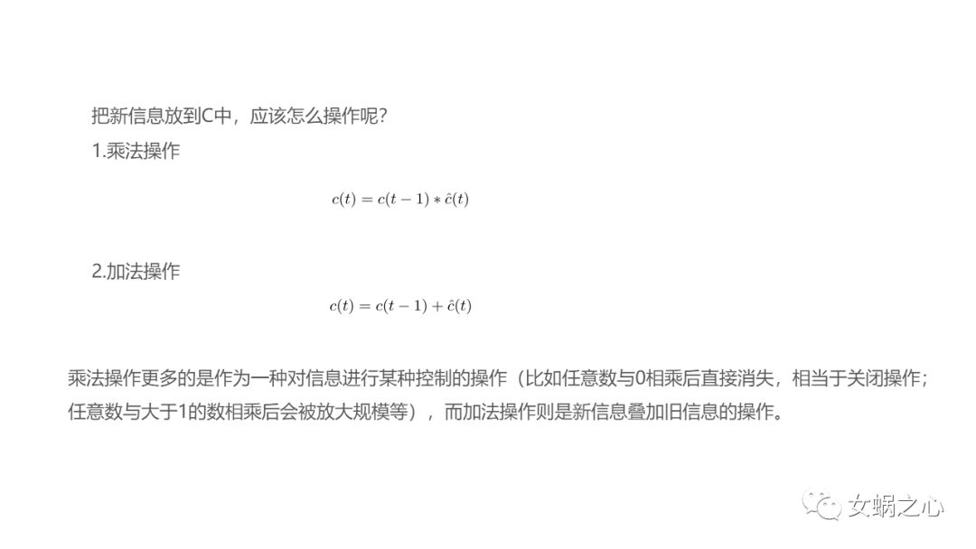 把新信息放到长期状态C,有两种操作,乘法操作,加法操作。