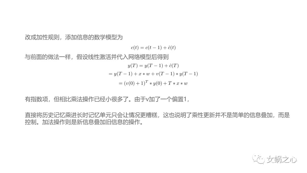 直接将历史记忆乘进长时记忆单元只会让情况更糟糕,这也说明了乘性更新并不是简单的信息叠加,而是控制。加法操作则是新信息叠加旧信息的操作。