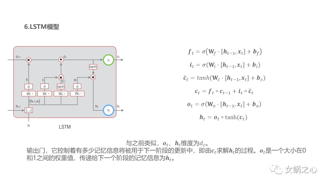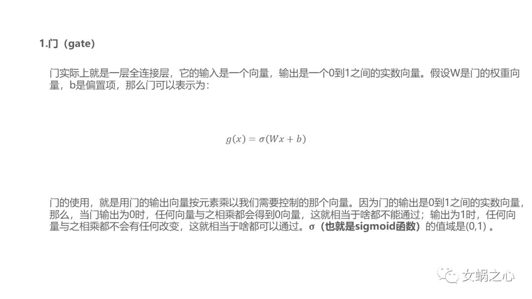 门的使用,就是用门的输出向量按元素乘以我们需要控制的那个向量。因为门的输出是0到1之间的实数向量,那么,当门输出为0时,任何向量与之相乘都会得到0向量,这就相当于什么都不能通过;输出为1时,任何向量与之相乘都不会有任何改变,这就相当于什么都可以通过。而这里sigmoid函数的值域是(0,1) ,所以门的状态都是半开半闭的。