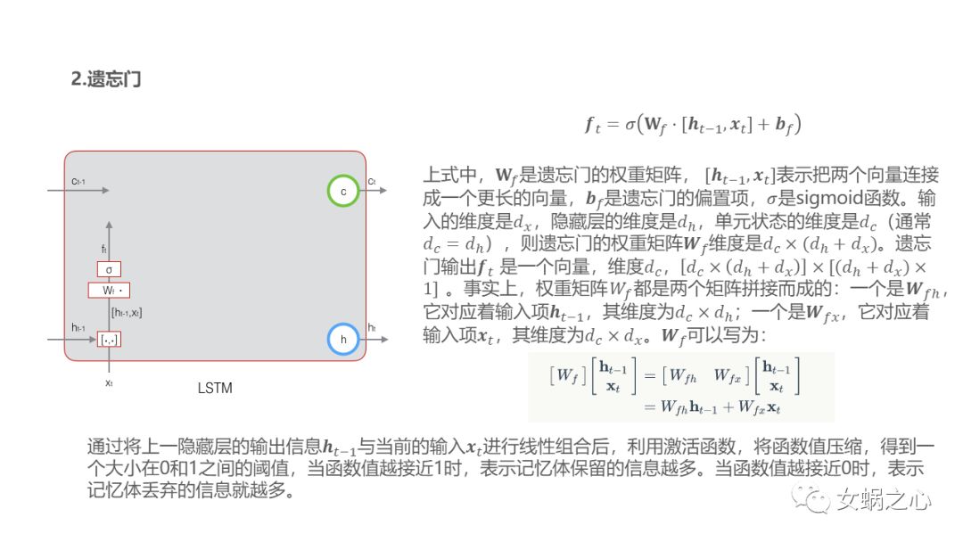 通过将上一隐藏层的输出信息与当前的输入进行线性组合后,利用激活函数,将函数值压缩,得到一个大小在0和1之间的阈值,当函数值越接近1时,表示记忆体保留的信息越多。当函数值越接近0时,表示记忆体丢弃的信息就越多。