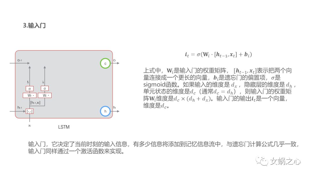 输入门决定了当前时刻的输入信息,有多少信息将添加到记忆信息流中,与遗忘门计算公式几乎一致,输入门同样通过一个激活函数来实现。