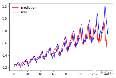 这里蓝色的是真实的数据集,红色的是预测的结果,可以看到,使用 lstm 能够得到比较相近的结果,预测的趋势也与真实的数据集是相同的.