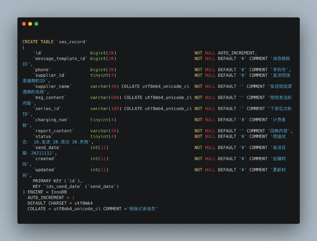 表吧,其实这表能说的不多(就是要把短信发送的记录以及短信的回执存储进去)。它的作用一方面是能追踪到为何发送给某个用户的短信失败了,另一方面是将这些记录进行关联做对账使用。
