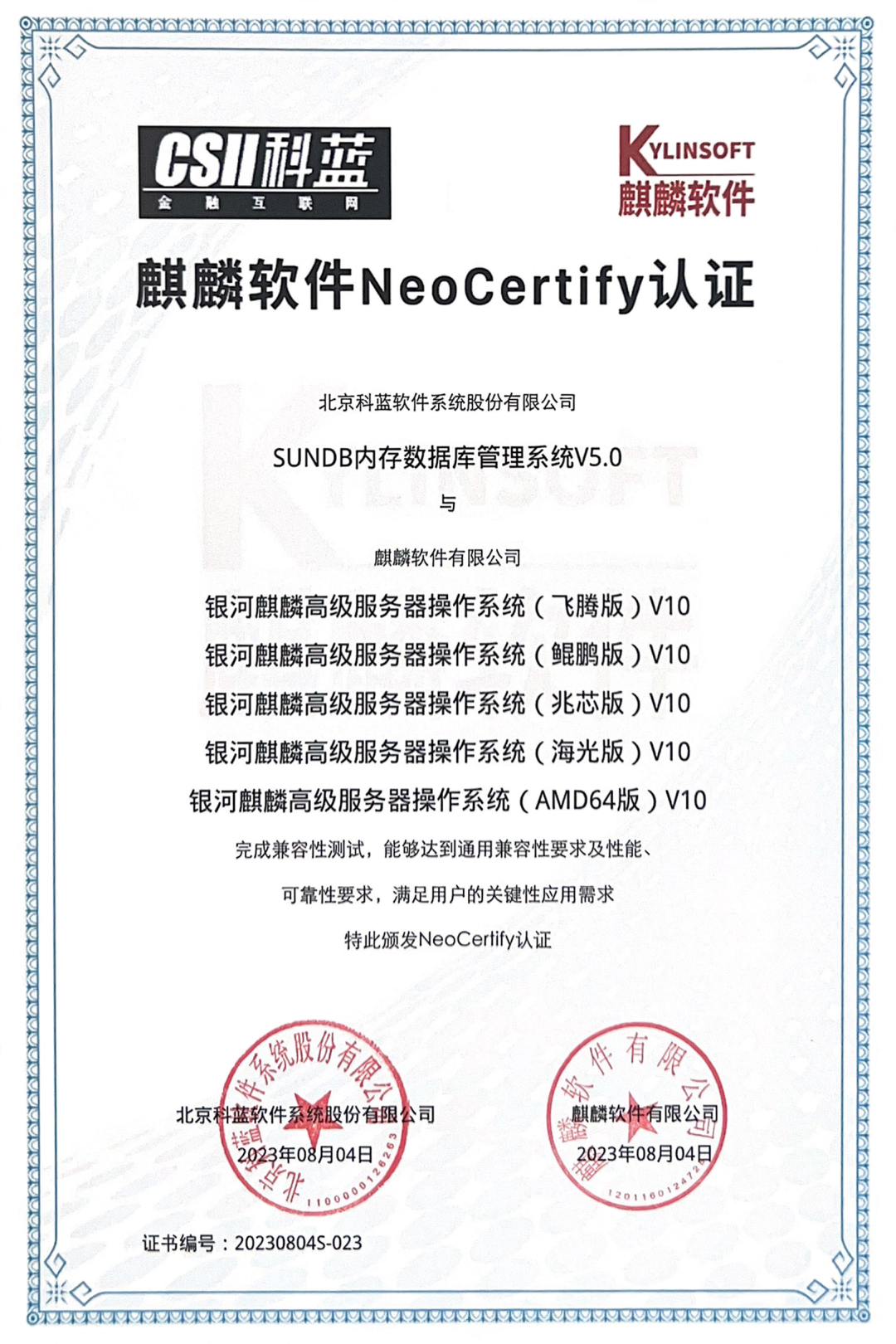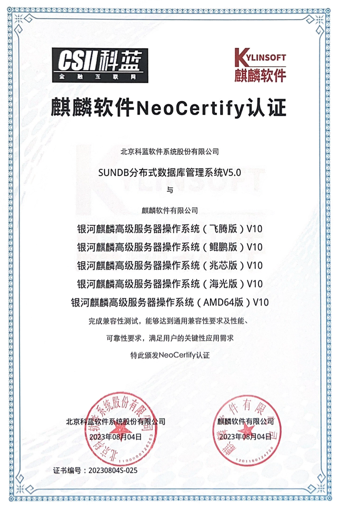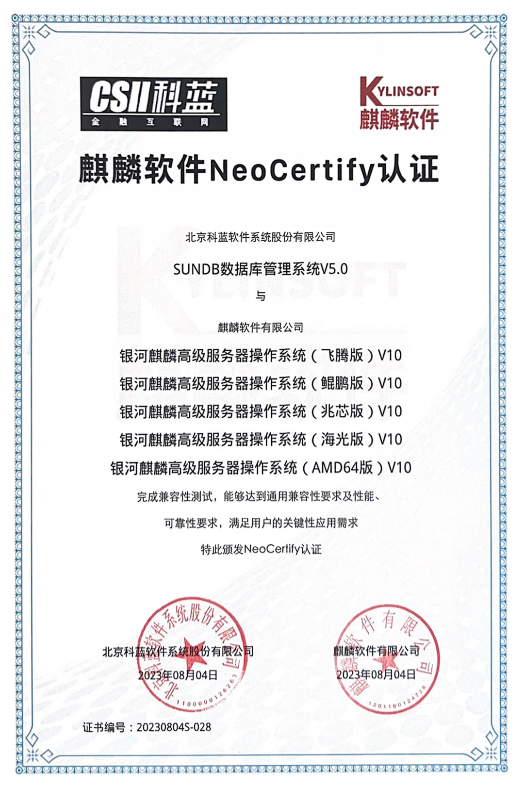 北京科蓝软件系统股份有限公司与麒麟软件有限公司完成产品互兼容适配认证。通过共同测试,科蓝软件SUNDB数据库管理系统V5.0、SUNDB分布式数据库管理系统V5.0、SUNDB内存数据库管理系统V5.0与银河麒麟高级服务器操作系统(飞腾版、鲲鹏版、兆芯版、海光版、AMD64版)V10能够达到通用兼容性要求及性能、可靠性要求,满足用户的关键性应用需求。