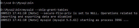 2、输入命令:mysqld --skip-grant-tables,回车,此时,启动MySQL的镜像: