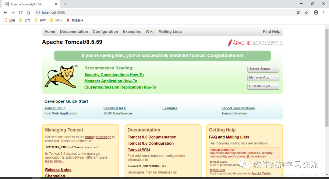 2、打开浏览器输入http://localhost:8080/验证一下,出现以下页面即说明tomcat安装成功