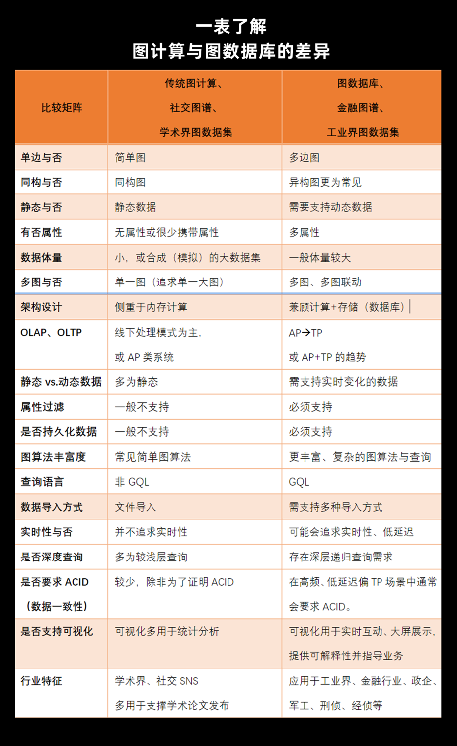 我们把图计算框架与图数据库做一个完整的对比,就会发现它们之间的差异极大,例如: